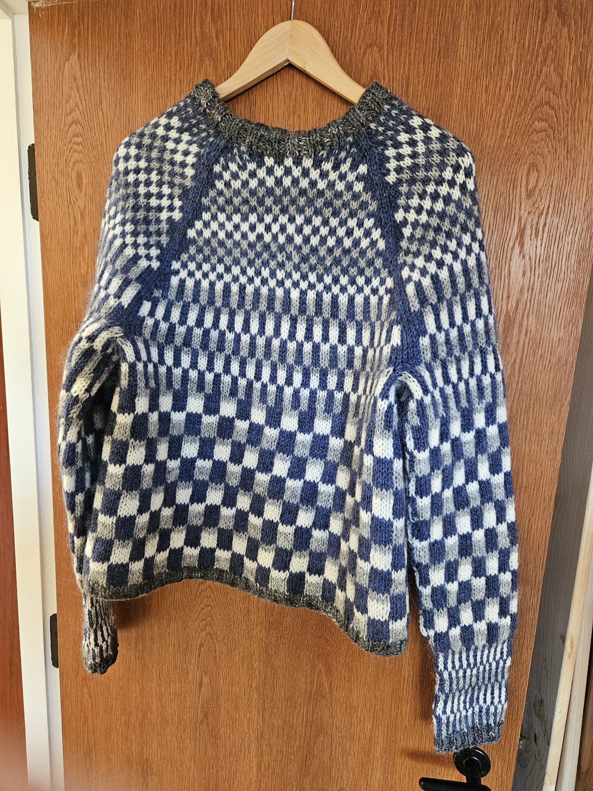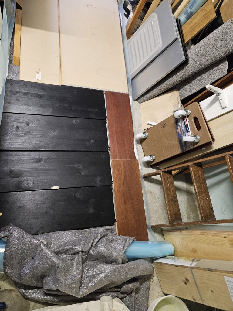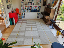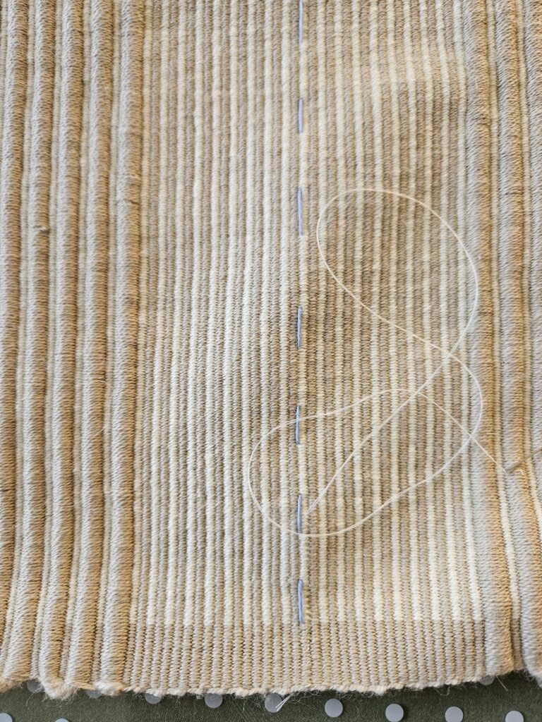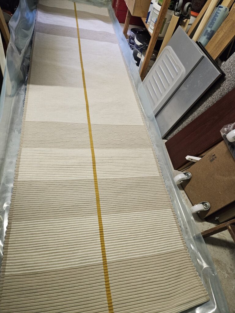 Så er tæpperne færdige, men de ligger underligt krøllede på gulvet. Jeg konsulterer ekspertisen i form af mine vævelærere, og det er en længerevarende opgave at fixe. Det kræver et vandtæt gulv, så jeg må i kælderen og får lige plads til et enkelt tæppe ad gangen på betongulvet i vores værksted. Plastic, tæppe, fugtige lagner, plastic og så træplader. Så går man rundt med museskridt på hele overfladen. Det gør man så flere gang i løbet af et døgn. Så bliver tæpperne fine.