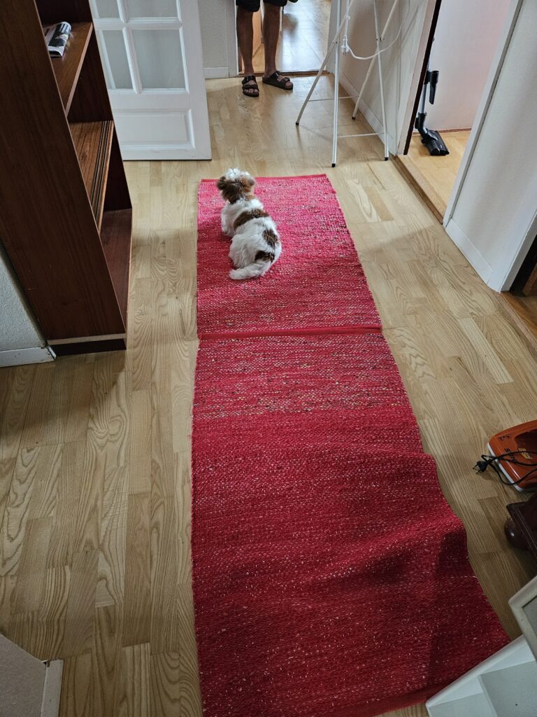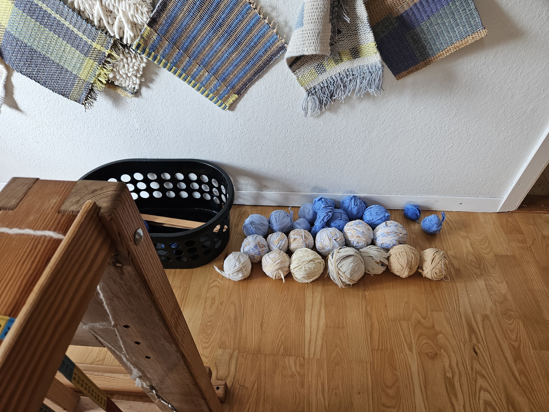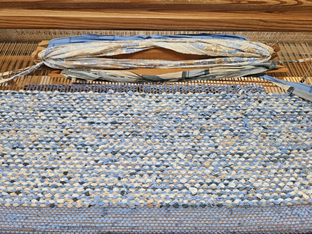 Først blev det til to røde kludetæpper, som blev klippet af væven, monteret i en fart indimellem male- og omflytningsprojekt og foræret til vores søn og svigerdatter, der har overtaget en dejlig lejlighed i München. Så knoklede jeg på med at væve færdigt, kludetæpper sviner noget så væmmeligt i vævestuen. Til sidst var der seks styk tæpper af 160×75 cm + et gult på 100×75 cm. De er til salg under fanen “Produkter” her på siden.