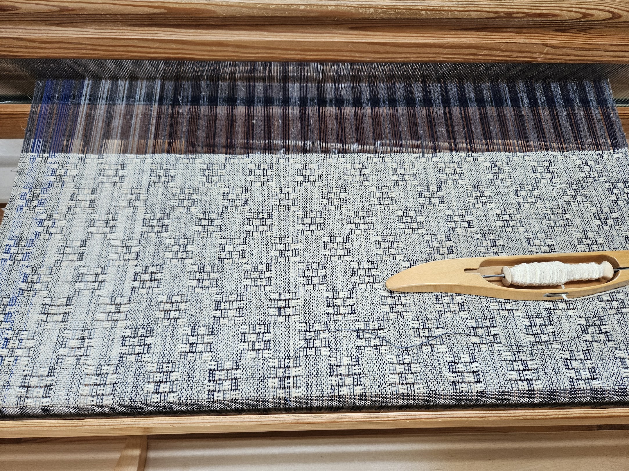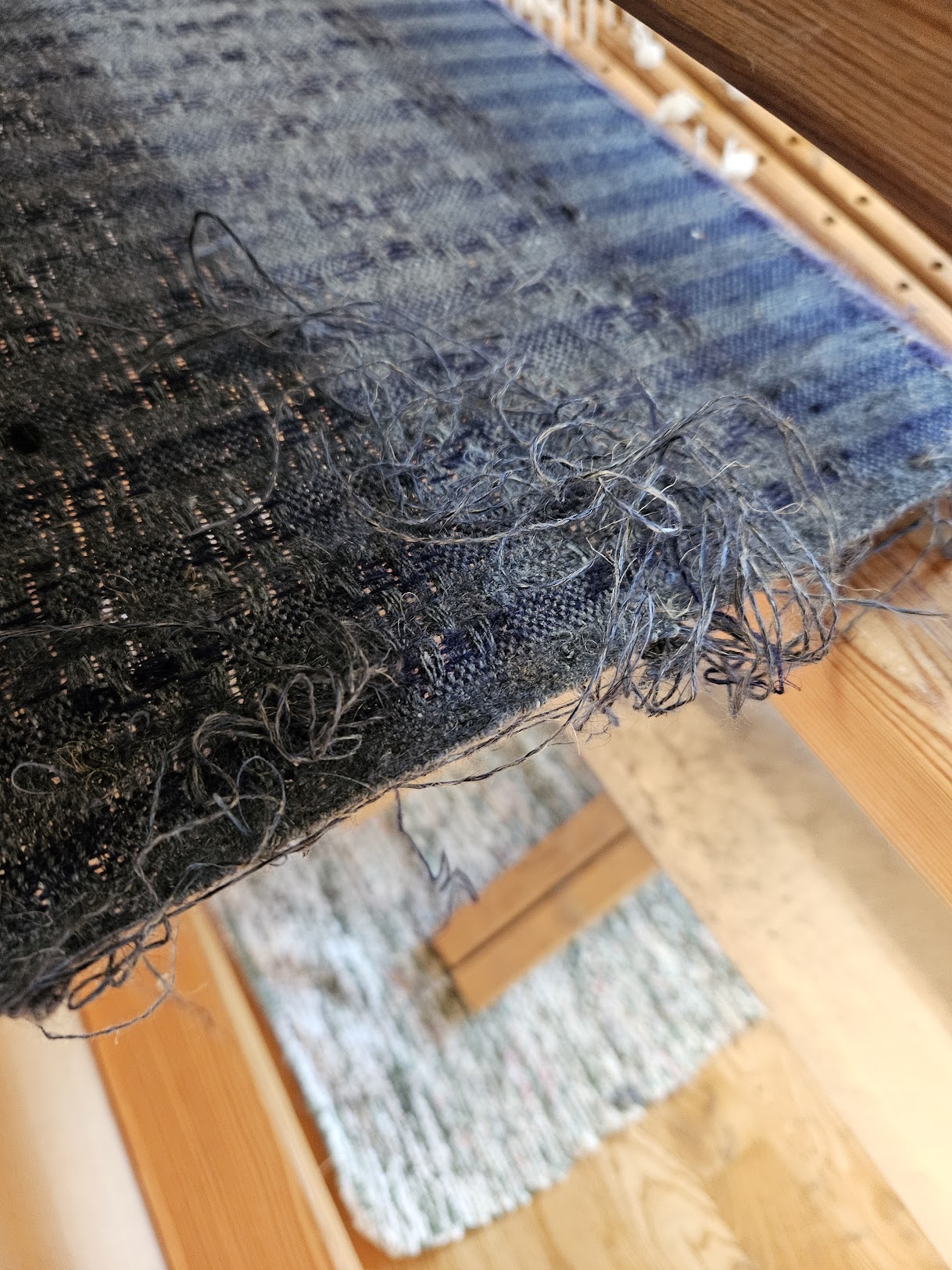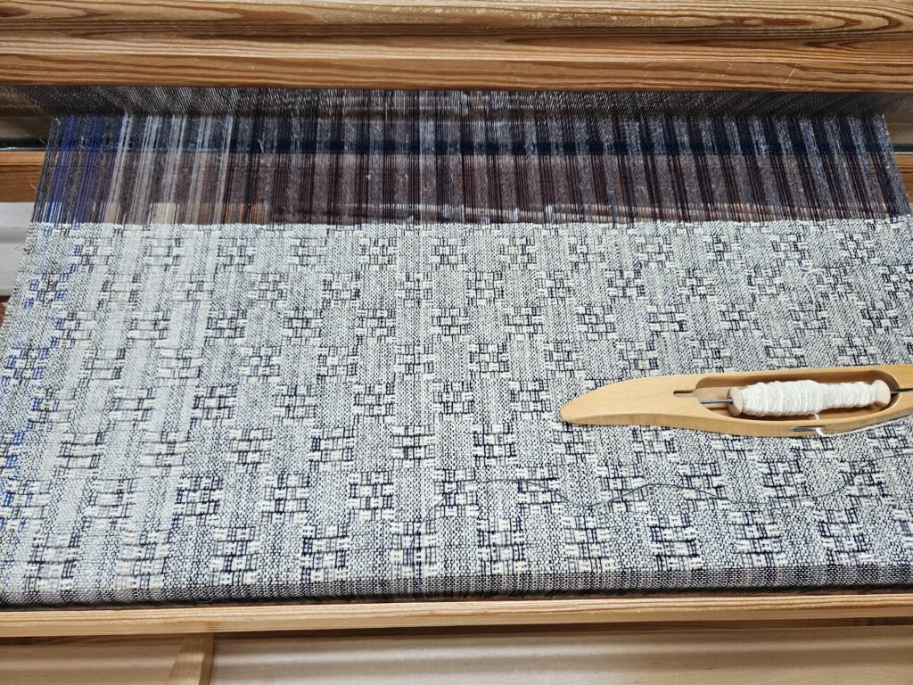 I sommer for længe siden sad jeg med først lyseblå, entrådet uld og strikkede en sweater, opskriften var Smell the rain fra Drops, men modificeret med tyskervendinger i nakken. Det var den slags entrådet garn, der trækker skævt, hvis man strikker glatstrikning, så jeg måtte finde en opskrift med lidt rib-agtigt. Jeg er vild med farven. Dernæst kastede jeg mig ud i dobbelt, tynd mohair, som jeg før har brugt til trend på væven. Men jeg ønskede mig en råhvid bluse, og denne, frit efter Helene Arnesens Lucrezia i bogen “Fabel knitwear”, blev ret vellykket. Ærmerne er med vilje ret lange, så de kan pose lidt over elastikken ved håndleddet.