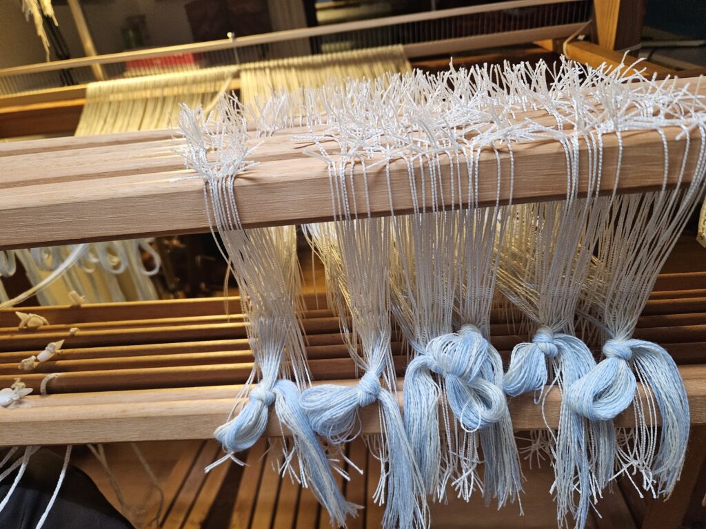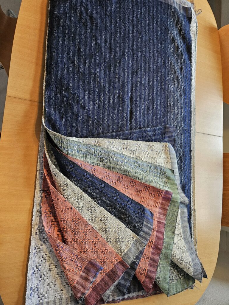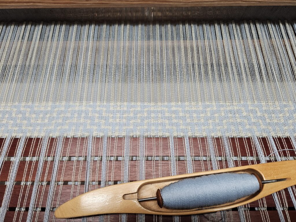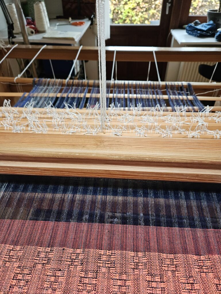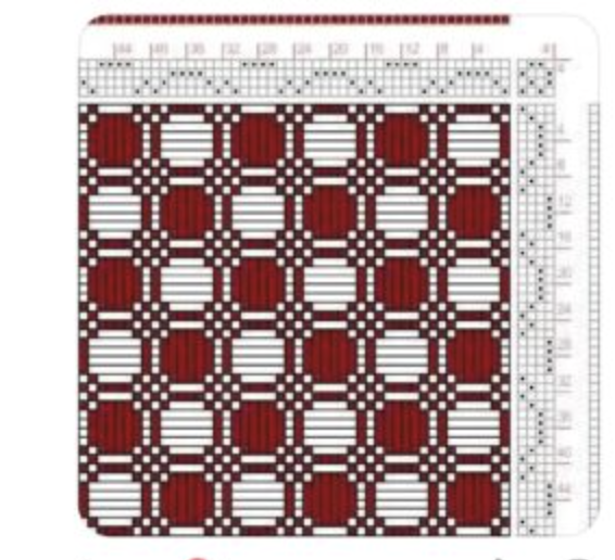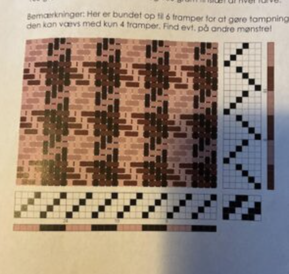Jeg bliver nødt til at gemme mulige vævemønstre her, for jeg falder somme tider over nogle, der må kunne bruges ved lejlighed. Den til venstre er jo cirkler – og så kun på 4 skafter. Den til højre har jeg døbt Harlekin. Det må kunne bruges til håndklæder.
